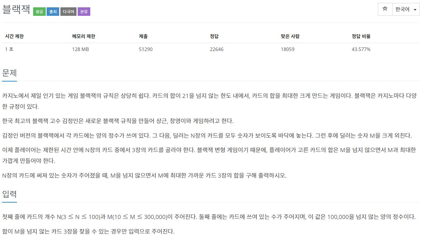 오늘은 백준 2798번 블랙잭 문제 알고리즘 포스팅을 해보겠습니다.
