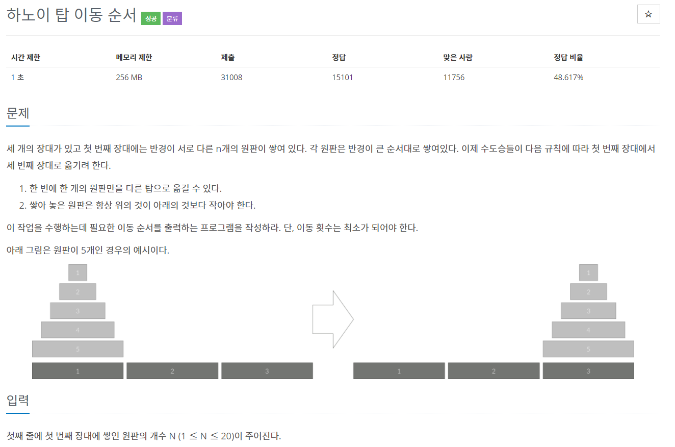 사실 학교에서 전공 공부를 하면서 하노이 탑 이동 순서와 관련한 문제를 접한 적이 있었는데 그때는 그냥 혼자 해결하기 위해 고민하는 시간 없이 구글링으로 과제를 했던 기억이 나 이번엔 반드시 내 힘으로 풀겠다!는 마음가짐으로 문제를 풀었습니다..!