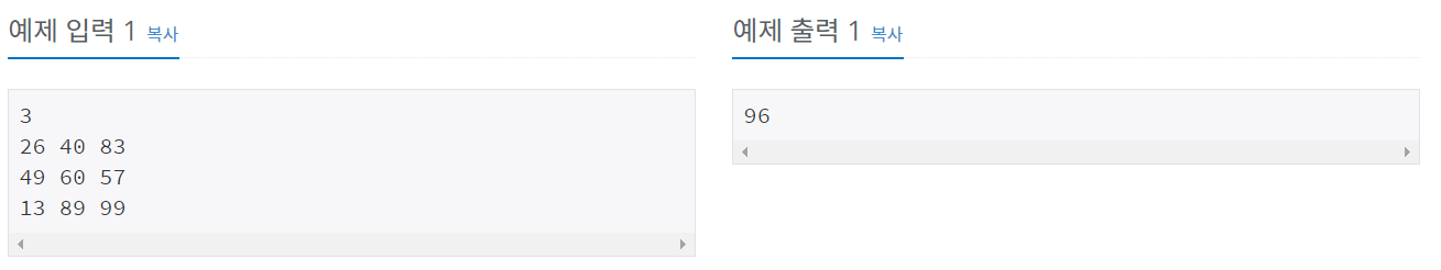 - 두 번째 집에서 예를 들어 RED로 칠한다고 하면 첫 번째 집에서의 GREEN, BLUE를 선택한 값 중 더 작은 값에 RED를 칠했을 때의 값을 더한 것이다.
