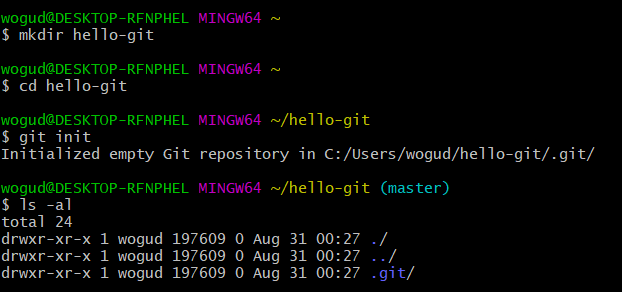 git init이라는 명령어를 사용하게 되면 "Initialized empty Git repository in 경로"라는 git이 성공적으로 초기화되었다는 문구가 뜨고 해당 디렉토리에 .git이라는 디렉토리가 생성이 된다. 이 디렉터리가 깃을 사용하면서 버전(version)이 저장될 '저장소(repository)'이다.