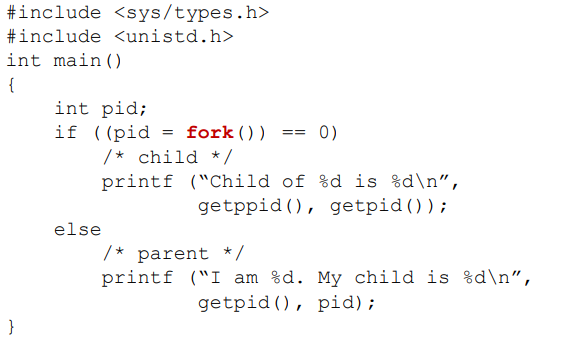 위의 예에서, 이 프로그램을 실행하던 Process A 가 있다고 했을 때, fork 함수를 발생시키면 그 위치까지의 Process A의 정보를 Process B (child) 가 물려받게 되고, Process B는 따라서 fork()를 발생시킨 그 다음 문장부터 실행되게 된다.