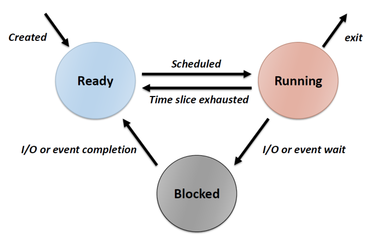 - Blocked : 일반적으로 I/O 요청이 필요할 때의 상태이다. 예를 들어 프로세스가 우리의 키보드 입력을 기다린다고 하면, 프로세스는 아무것도 할 수 없는 상태이기 때문에, blocked 상태가 되고, 다른 프로세스가 실행할 수 있게 한다. 만약 입력이 끝나면, ready 상태가 되어 OS 의 선택을 기다린다.