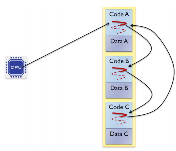 위의 그림과 같이, CPU는 프로세스 A를 조금 수행하다가, B의 코드로 점프하고, C로 점프하고, 이 과정을 반복할 수 있는데, 실제로 이는 우리가 다룰 내용인 가상화(Virtualization)이 아니다.
