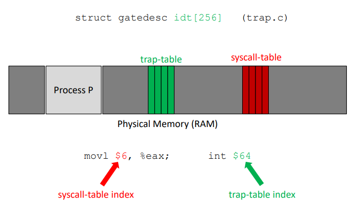 우측의 초록색 글자로 trap-table index가 64번이라고 주어졌는데, trap-table의 64번에 바로 syscall-table이 저장되어 있는 것이다.