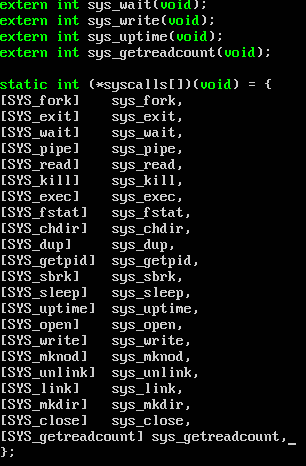 내 user code 에서 getreadcont를 호출했다면 실제로 getreadcount라는 system call을 정의해줘야 한다.