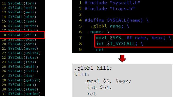 usys.S 에 들어가보면 여러가지 시스템콜들이 define 되어있는 걸 볼 수 있는데, kill은 오른쪽과 같은 과정을 거쳐 정의된다. 잘 보면 movl $6 으로 바뀐 것을 볼 수 있는데 이건 도대체 어떻게 된 것인지 살펴보자.