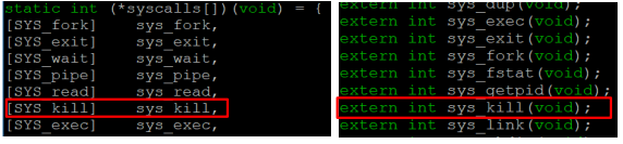 이 중에 우리가 user mode ( user code라고도 이해 가능) 에서 호출하였던 kill 이라는 시스템 콜이 정의되어 있다.