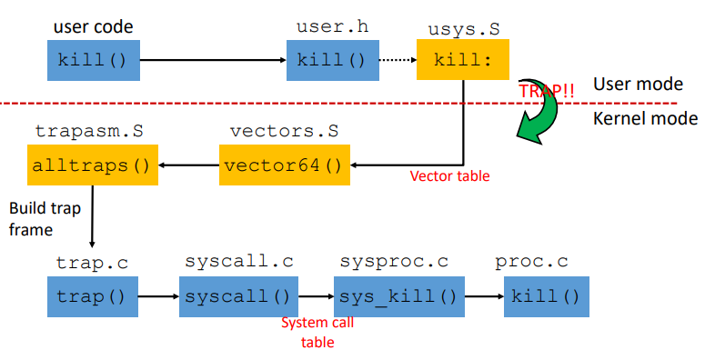 user code에서 kill을 호출하게 되면, 먼저 user.h를 통해 이것이 system call 함수라는 것을 확인한 후 usys.S 를 거쳐 kernel mode로 진입을 하게 된다. 과정을 쭉 따라가다가 이제 trap.c에서 system call 의 number인 64를 받아서 system call인 것을 확인하고 syscall.c 파일의 syscall() 함수를 호출하게 되며, syscall 함수에서는 eax에 저장되어 있던 6 이라는 값을 참조하여 6번 system call 인 sys_kill 함수를 호출하게 되고, sys_kill 에서는 proc.c에 있는 실질적으로 kill 동작을 수행하는 kill() 함수를 호출하는 것이다.