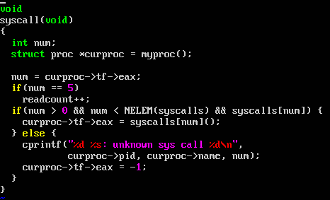 syscall.c 에 들어가보면 syscall 함수가 정의되어있다. 먼저 trap.c 에 들어가보면 만약 trap의 number가 64이면 syscall함수를 호출한다고 나와있는데, 아까 위에서 언급했다시피 xv6에서는 eax 레지스터에 syscall의 number를 저장한다. 따라서 num 변수에 6을 저장하고, 6번째 시스템콜인 kill 시스템콜을 호출하게 되는 것이다.