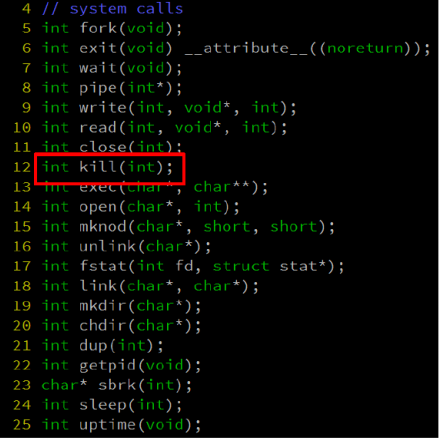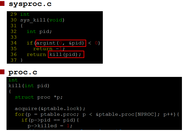 실제로 sysproc.c 에 가보면 모든 system call 함수들이 선언이 되어 있는데 sys_kill 같은 경우도 user code에서 system call 을 호출할 때 전달받았던 인자를 pid변수에 저장한 후, 이를 proc.c에 있는(실제로 kill 동작을 수행하는(?) ) 함수 kill을 호출하게 된다.