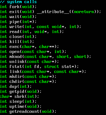 user.h 라는 헤더파일을 보면 이렇게 기본적인 system call 들이 선언되어 있다.