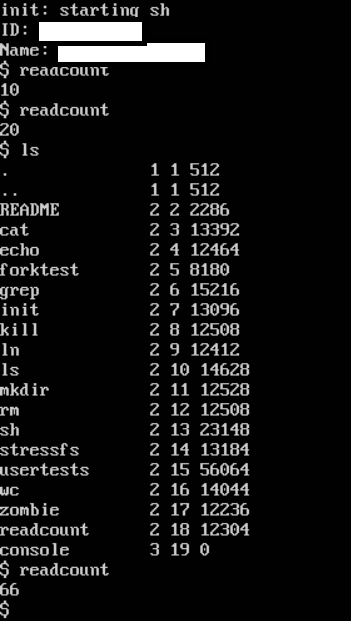 getreadcount라는 시스템 콜을 만드는 것이고, 이는 프로세스들이 read() system call 을 몇 번 호출했는지를 반환하는 system call이다. 실제로 xv6에서 readcount를 입력하면 그 횟수가 출력이 되어야한다.