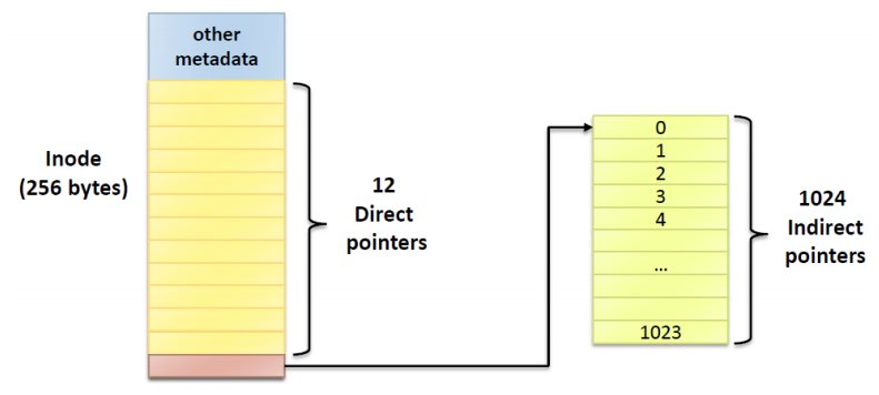 위 그림의 경우 12개의 direct pointer가 있고 하나의 indirect block안에 1024개의 indirect pointer가 있는 것을 알 수 있다.