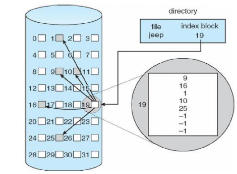 이런 경우 sequential access의 performance는 data block 들이 어떻게 놓여있는지에 따라 다르고, 모든 data block들에 대한 pointer와 현재 파일의 크기 이상에 대한 포인터(-1)도 갖게되므로 metadata 에 엄청난 overhead가 있다.