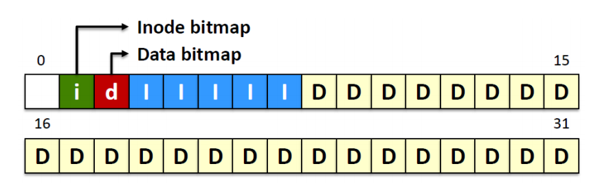 Inode bitmap과 Data bitmap이 있는데, 각각의 bit는 상응하는 block 또는 inode가 free(0)한지 아니면 사용중(1)인지 나타낸다.