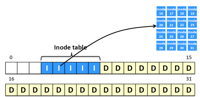 만약 한 inode당 256B의 크기를 가진다고 하면 4KB(VSFS에서 한 블록의 크기 가정)에는 16개의 inode가 저장될 수 있다.