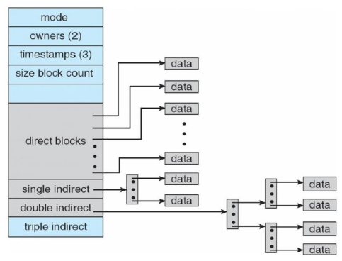 동적으로 data block에 대한 pointer를 할당하며, 적은 수의 direct pointers, 그리고 나머지 indirect pointer들을 갖게 된다.