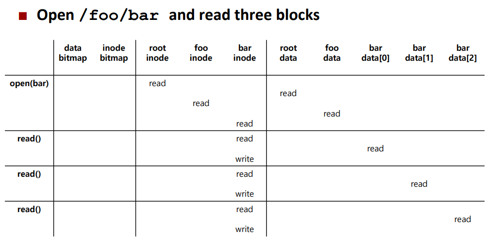 먼저 / (root) 부터 시작하므로 (보통 root는 unix에서 inode number 2임) 파일 시스템은 inode number 2를 포함하는 block을 읽는다. 그 후 root directory의 metadata중 datablock을 가리키는 포인터를 찾고 여러 directory data block 들을 읽어가면서 foo 라는 directory를 찾아낸다. 또 다시 위의 과정을 통해 원하는 inode ("bar")를 찾아낸다. 그 후 권한을 체크하고 file descriptor를 해당 process 에 할당해주고 user에게 반환한다.