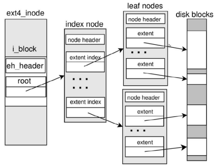 각각의 leaf node는 <starting block #, extent size> 를 갖고 있으며 contiguous allocation 의 단점을 줄이고 장점은 최대한 유지한 방법이라고 할 수 있다. 따라서 여전히 좋은 sequential access performance를 보이고 metadata에 대한 overhead가 상대적으로 적다.
