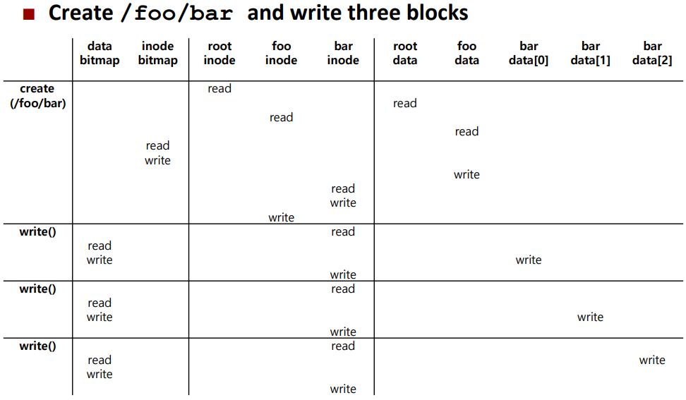 새로운 파일을 쓸 때는 각 write는 데이터를 디스크에 기록해야 할 뿐만 아니라 파일에 어느 블럭을 할당할지를 결정해야 하고, 그에 따른 다른 자료 구조들을 갱신해야 한다.(data bitmap, inode, ...)