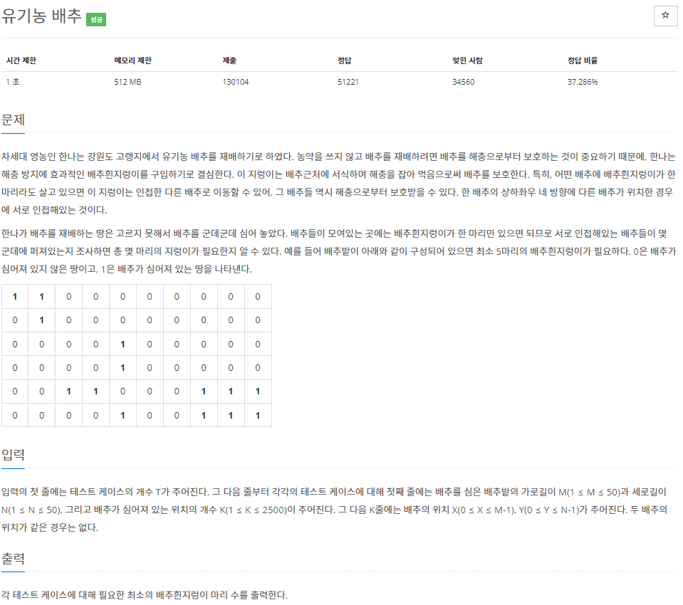 위의 문제 설명을 풀어보면, 결국은 1로 이루어진 덩어리의 개수가 몇 개인지 파악하는 문제이다. 덩어리에는 배추가 하나가 있을 수도, 두 개, 혹은 여러 개가 있을 수도 있다.