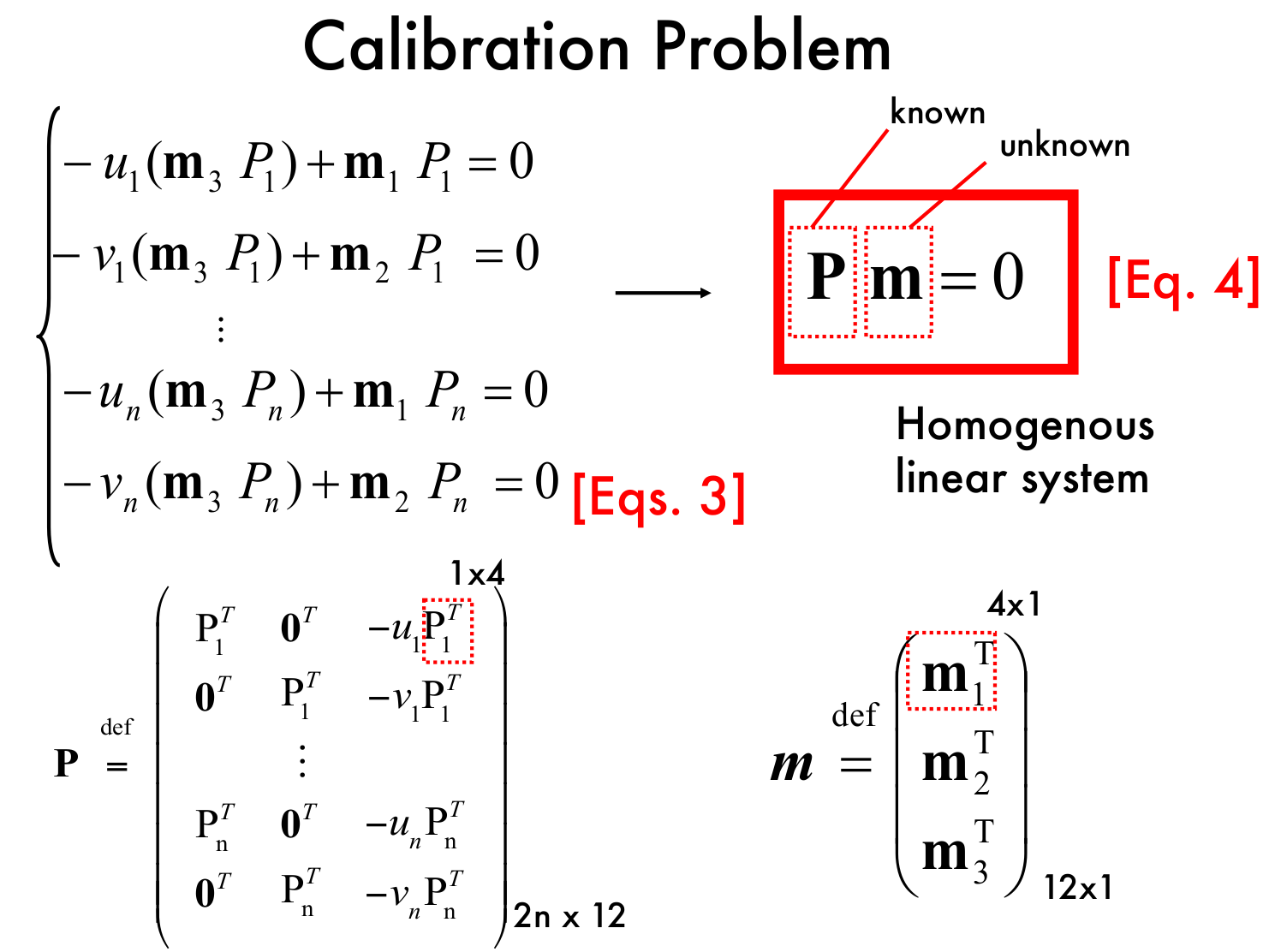 $$ \begin{bmatrix}P_1^T & 0^T & -u_1P_1^T \\ 0^T & P_1^T & -v_1P_1^T \\ &\vdots& \\ P_n^T & 0^T & -u_nP_n^T \\ 0^T & P_n^T & -v_nP_n^T\end{bmatrix}\begin{bmatrix}m_1^T \\ m_2^T \\ m_3^T\end{bmatrix}=\mathbf{P}m=0 $$