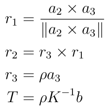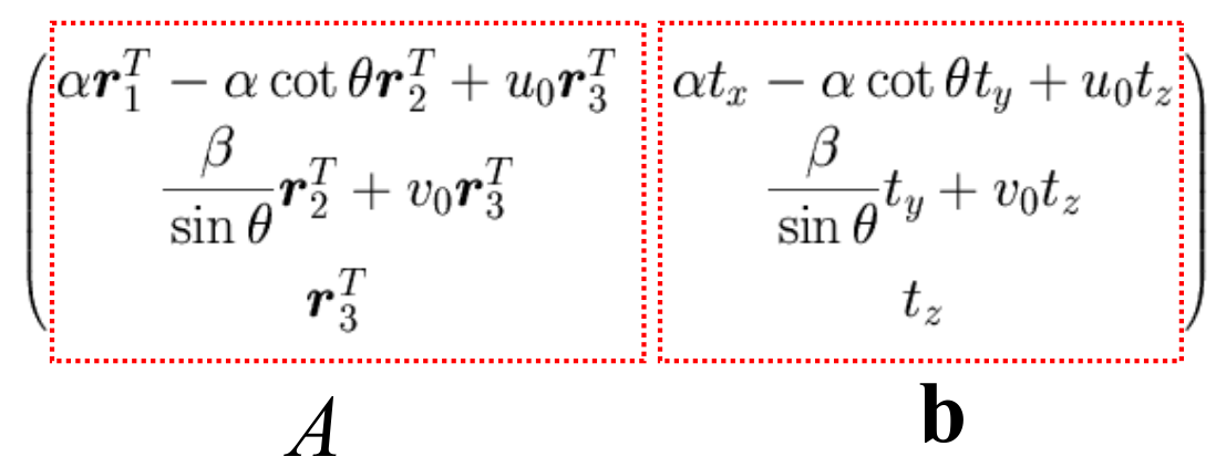 $$ M=\frac{1}{\rho}\begin{bmatrix} \alpha r_1^T-\alpha\cot\theta r_2^T+c_xr_3^T & \alpha t_x-\alpha\cot\theta t_y+c_xt_z \\ \frac{\beta}{\sin\theta}r_2^T+c_yr_3^T & \frac{\beta}{\sin\theta}t_y+c_yt_z \\ r_3^T & t_z \end{bmatrix}=\begin{bmatrix}A & b\end{bmatrix}=\begin{bmatrix}a_1^T \\ a_2^T \\ a_3^T\end{bmatrix}\begin{bmatrix}b_1 \\ b_2 \\ b_3\end{bmatrix} $$