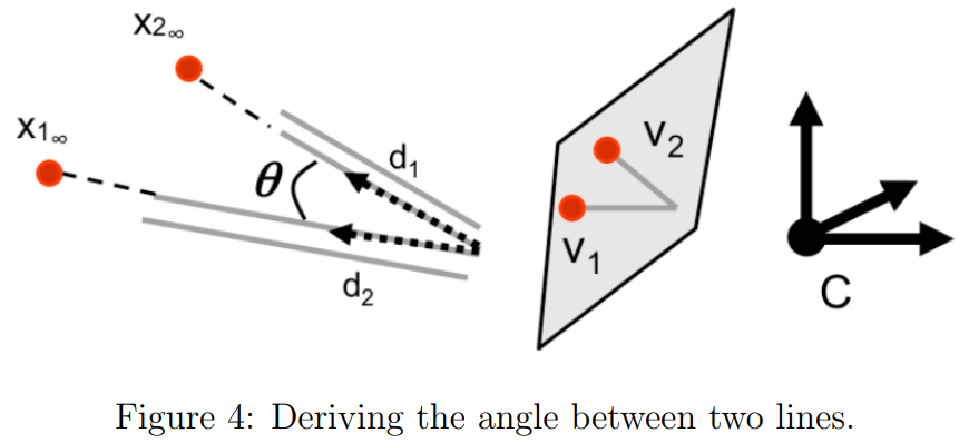 그리고 $v_1,v_2$이 그에 상응하는 vanishing point라고 했을 때, $d_1,d_2$가 이루는 각 $\theta$는 다음과 같다.