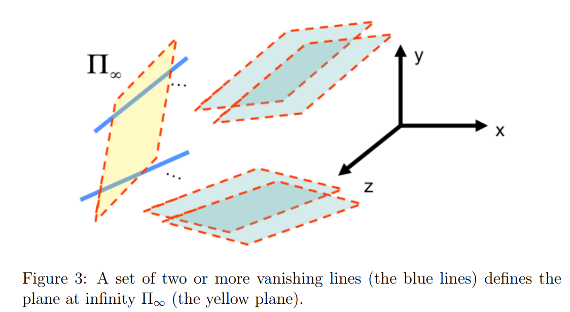 3D 상의 평행한 직선들을 통해서 이 평행한 직선들의 vanishing point와 camera parameter인 $K,R,T$ 를 도출해낼 수 있다.