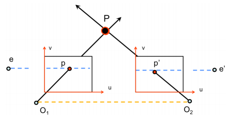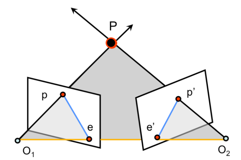 - $O_1,O_2,P$ 로 형성되는 평면을 epipolar plane