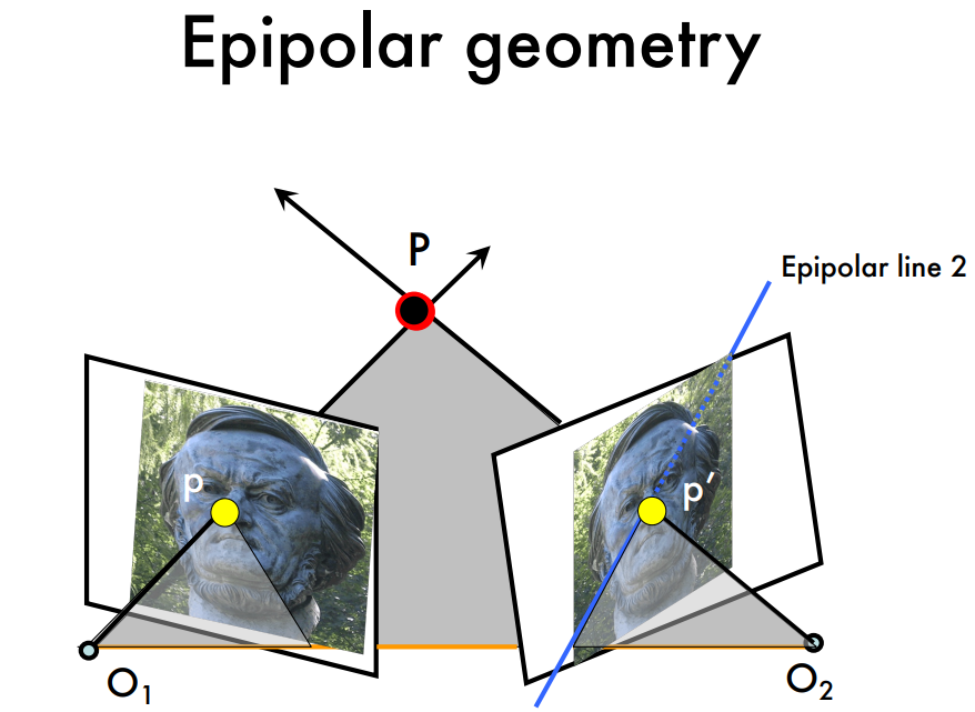 - Epipolar plane과 두 image plane과의 intersect를 epipolar lines(파란선)