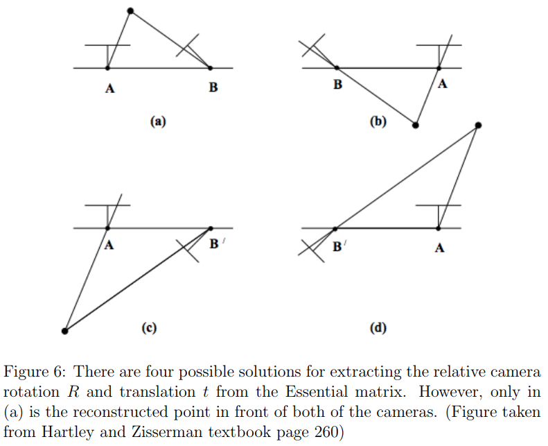 올바른 $R,t$ 쌍에서, triangulated point $\hat{P}$는 두 카메라의 앞에 있어야 하고, 이는 이 점이 두 카메라 좌표계에서 $z$축으로 양의 값을 가짐을 의미한다.