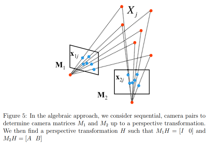 이 대수적 접근법의 주 아이디어는 perspective transformation $H$가 적용된 카메라 행렬 $M_1, M_2$를 계산해내는 것이다.