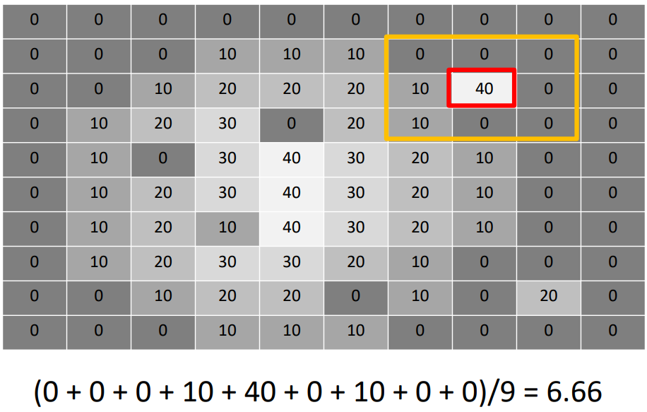 - 각 픽셀을 주변 픽셀의 평균으로 대체한다.