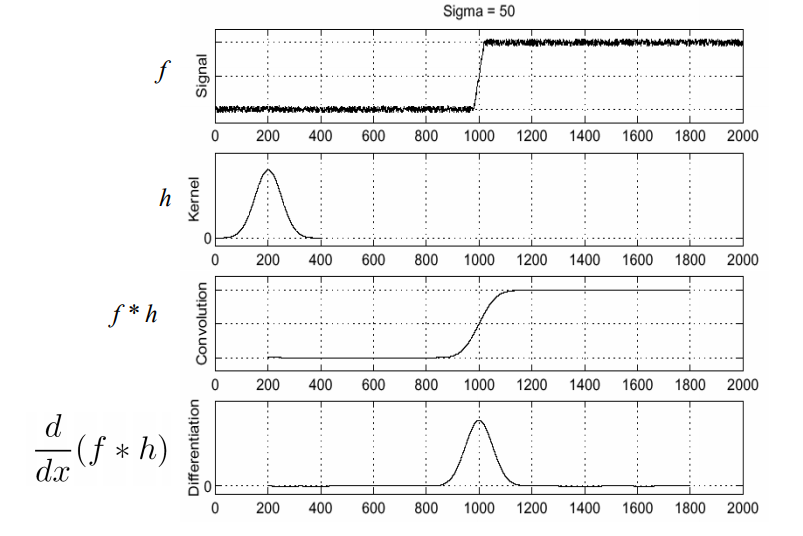 따라서, noise가 있는 intensity function에 gaussian filter를 적용하면 세 번째 줄의 그래프처럼 상당히 smooth한 function을 얻을 수 있다.
