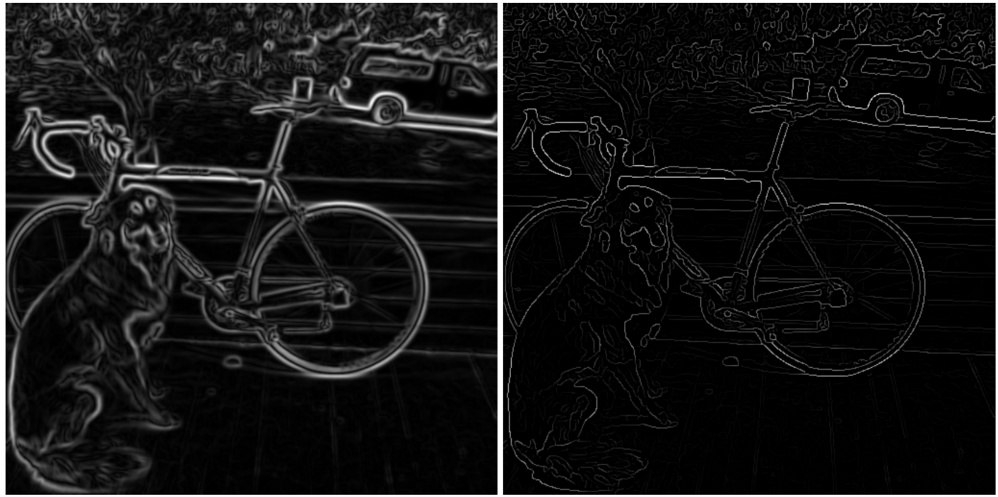 여기서 non maximum suppression이란, 해당 pixel이 gradient의 양방향에 있는 pixel보다 커야만 그대로 두고, 아닌 경우 0으로 아예 죽여(?)버리는 기법을 의미한다.