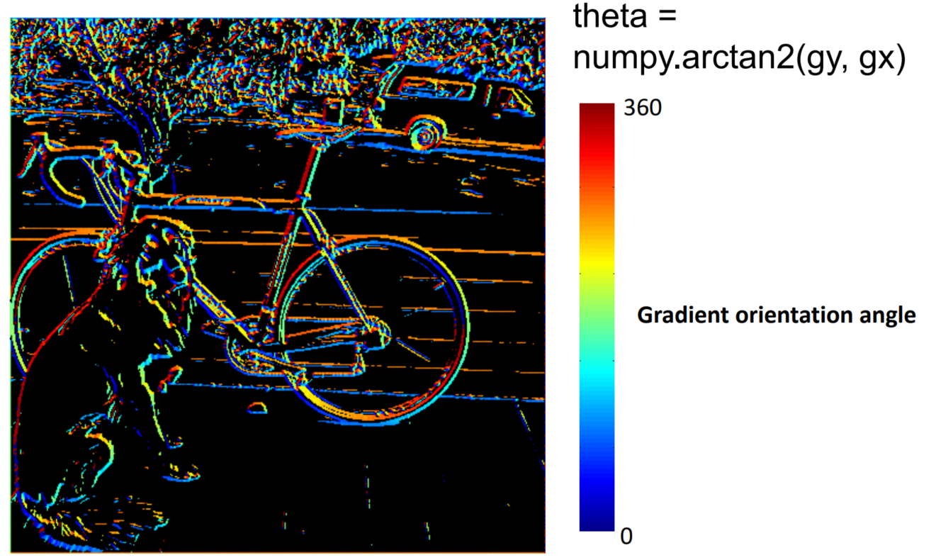 Sobel operator로 얻은 $x,y$축에 대한 값을 arctan를 이용해 각 $\theta$를 구한다.