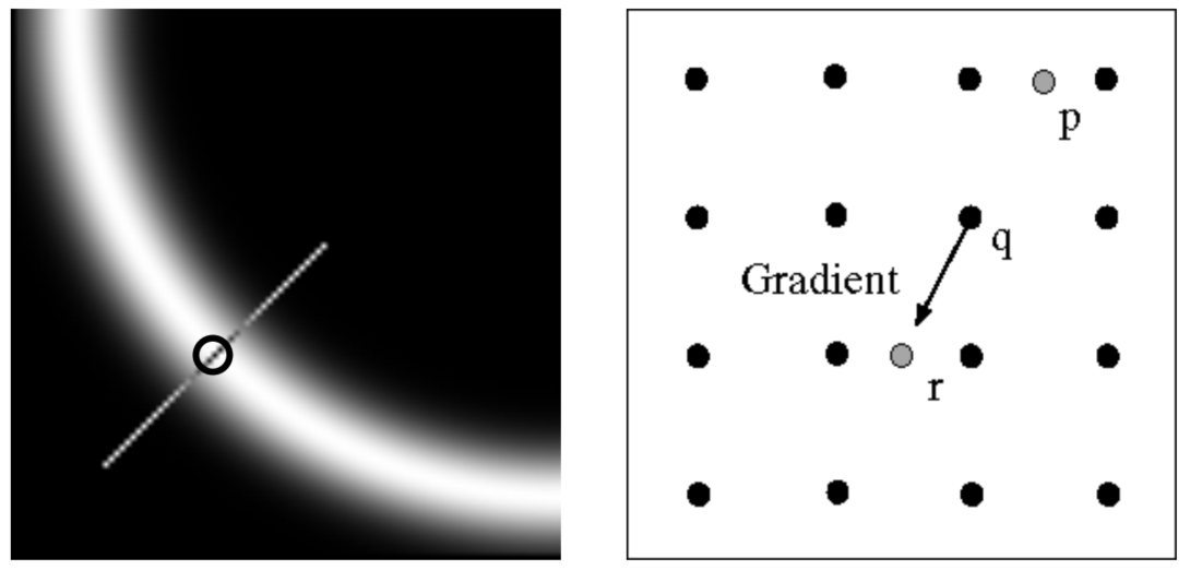 하지만, NMS를 보통은 [0, 45, 90, 135]의 네 방향에 대해서만 적용하는데, 따라서 해당 각도들이 아닌 각도들을 [0, 45, 90, 135]의 방향으로 interpolating해주는 작업이 필요하다.