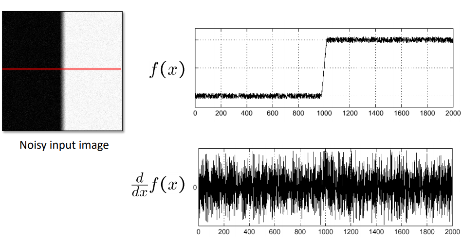 이처럼 noise가 있을 경우에는 미분을 해서 극값을 이용해 edge를 찾는 게 매우 challenging하다.