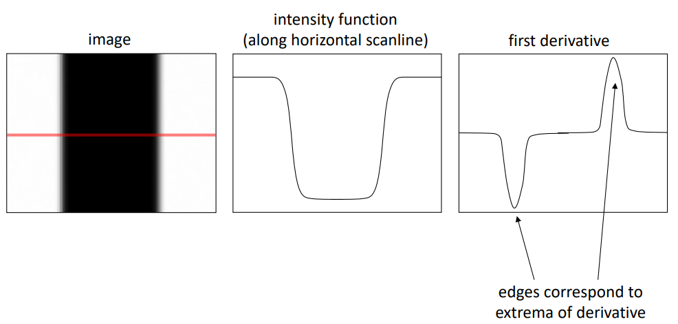 즉, 이 intensity function을 미분해보면, 우측 그림처럼 미분의 값이 가장 extreme한 곳(극값)이 edge라고 할 수 있을 것이다.