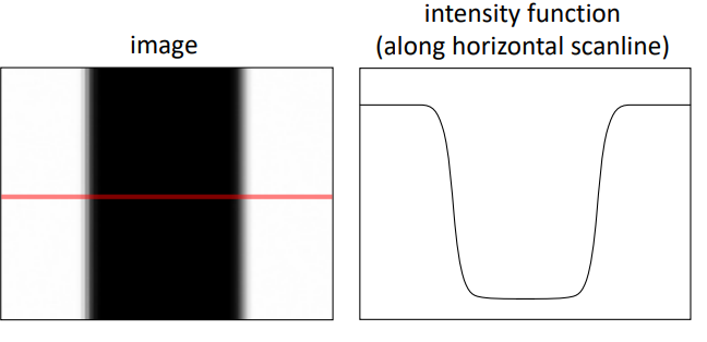 제일 좌측 그림을 본래 image라고 한다면, intensity는 중간 그림처럼 해당 부분에서(horizontal 방향을 따라) 아래로 급격히 떨어졌다가 다시 오르는 형태를 띄게 된다.