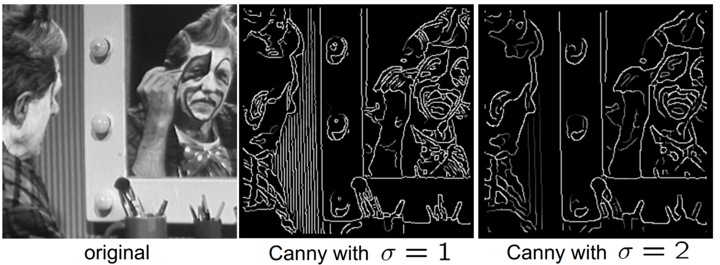 Canny edge detector는 여러 parameter로 조정을 할 수 있는데, 그 중 $\sigma$에 대해 다뤄보자면, $\sigma$는 gaussian blurring의 width를 조정한다고 할 수 있다.